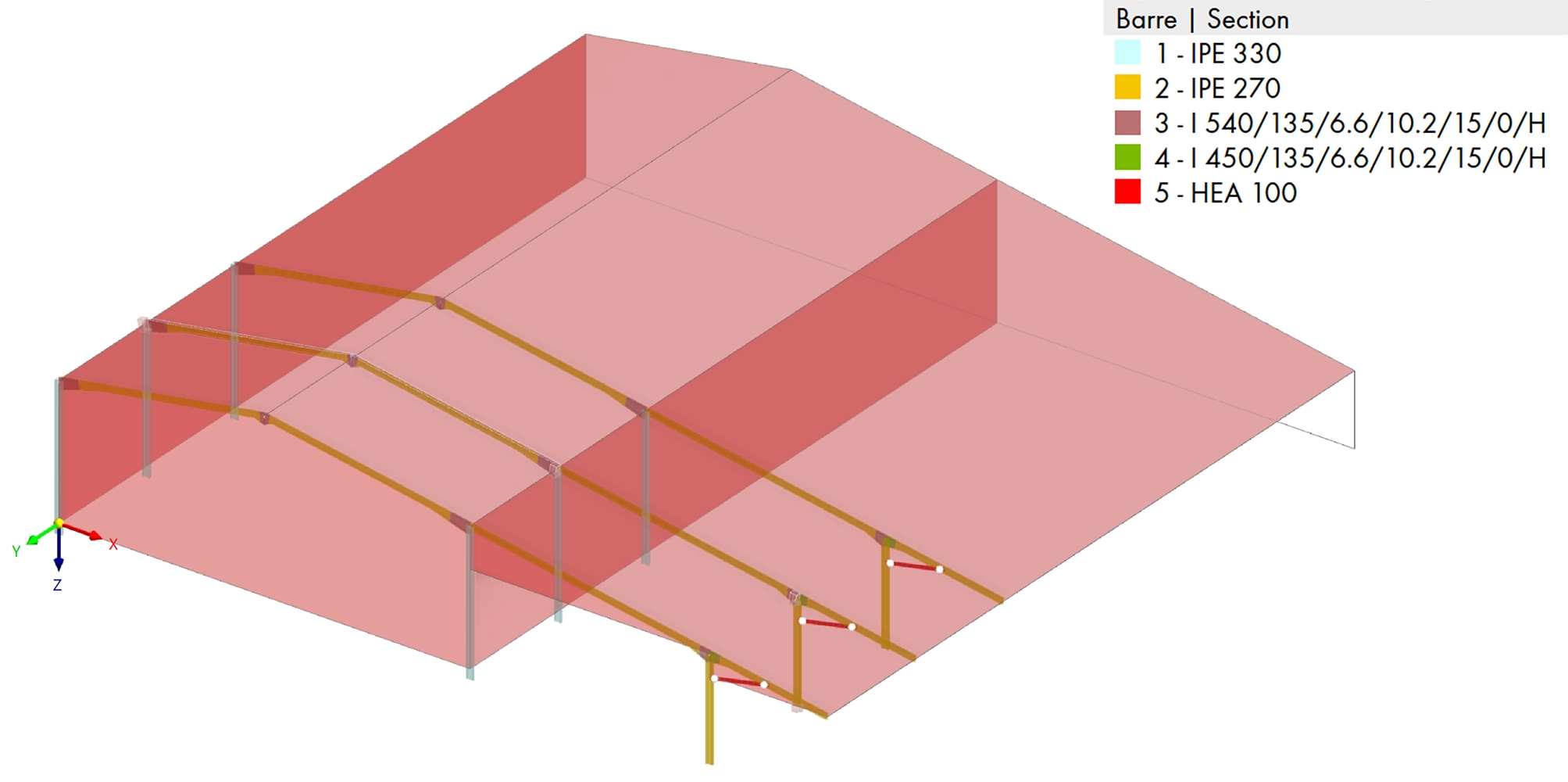 L’audit a révélé des non-conformités majeures aux Eurocodes, notamment des instabilités au flambement et des dépassements critiques de la capacité portante des pannes et arbalétriers (jusqu’à 157% de flèche). Face à ce constat, nos ingénieurs ont conçu une stratégie de renforcement. La solution inclut le moisage systématique des poteaux avec des UPE 270, le remplacement des pannes par des profilés C200 plus rigides, et la refonte du système de contreventement (poutres au vent et bracons anti-déversement).