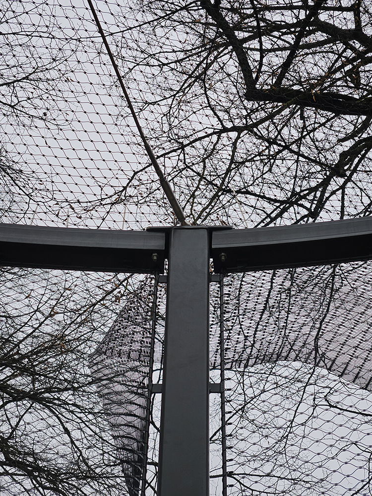 L’expertise d’A3C a permis de valider une ossature métallique sécurisée, durable et parfaitement intégrée aux exigences esthétiques du parc, tout en s’affranchissant des critères de flèche standards pour privilégier la performance réelle de la structure câblée.