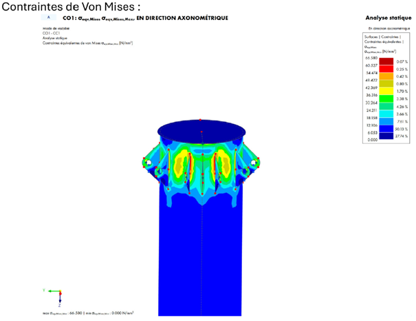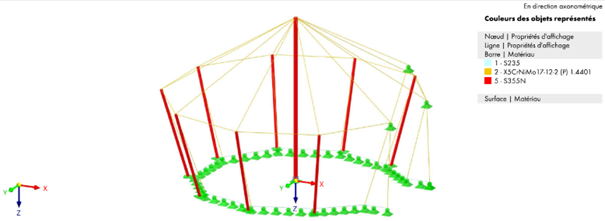 Nos ingénieurs ont réalisé une analyse par méthode des éléments finis via le logiciel Dlubal RFEM 6. L’étude a porté sur l’optimisation des poteaux en profilés creux (CHS), des câbles en acier inoxydable AISI 316 et des systèmes d’ancrage sur longrines et murs. Chaque composant a été vérifié selon les Eurocodes 0, 1 et 3, garantissant une résistance optimale face aux phénomènes de flexion et de flambement.